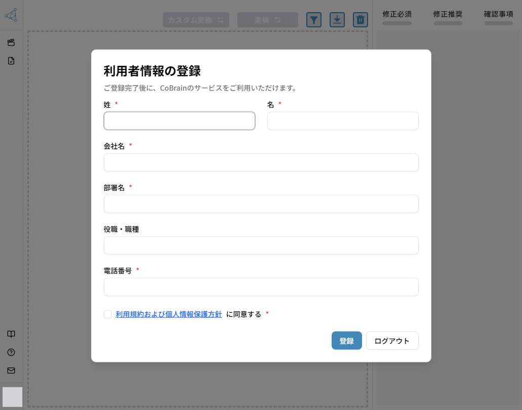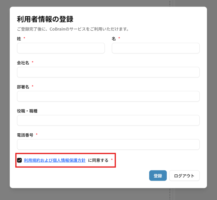 CoBrain のご利用前に、当社個人情報保護方針への同意(サービスの利用、Web サイトにおけるフォームの送信など)が既に行われている場合、起動時には利用者情報の更新画面が表示されます。