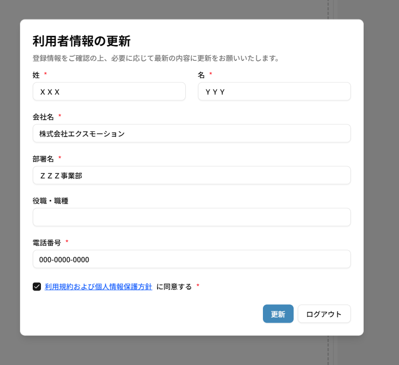 はじめてログインする際には、利用者情報の登録が必要です。 氏名、会社名、電話番号等の情報を入力していただき、利用規約および個人情報保護方針に同意していただく必要があります。 この手順は初回ログイン時のみ実施が必要です。
